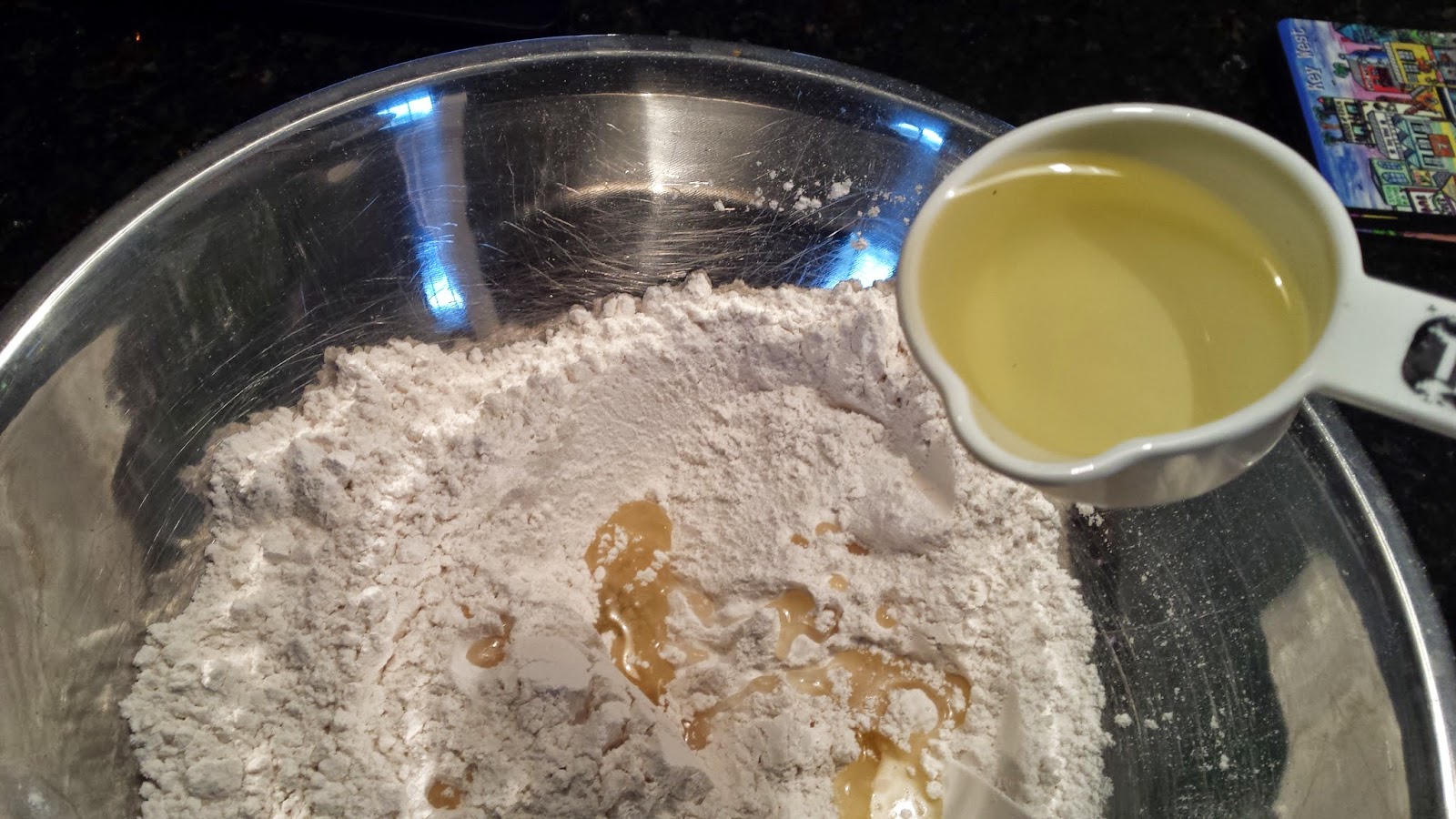Then I slowly added the olive oil to the dry ingredients. It says you should use a mixer but I don't have one so this batter was mixed by hand.